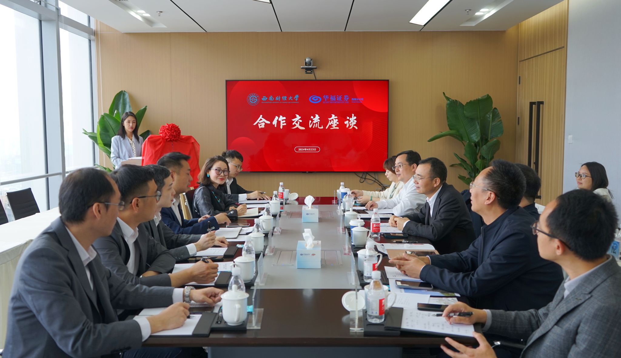 金融学2000级校友、华福证券西南分公司党委书记、总经理刘骥向马永强一行介绍了总公司和分公司经营现状和发展态势。刘骥表示,公司愿为母校提供全方位服务支持,在人才培养、实践教学等方面与学校紧密合作,并通过资源共享和优势互补,共同推动金融教育进步发展,为社会输送更多优秀金融人才。