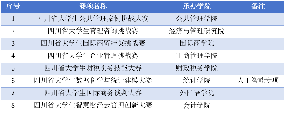 近日,四川省教育厅公布2024年省级本科高校大学生竞赛项目评选结果,我校申报的“四川省大学生公共管理案例挑战大赛”“四川省大学生管理咨询挑战赛”等8个竞赛项目,经专家评审和网上公示后获批立项。本年度全省累计97个竞赛项目获批,我校在立项数量上位居全省高校第二,取得重大突破。