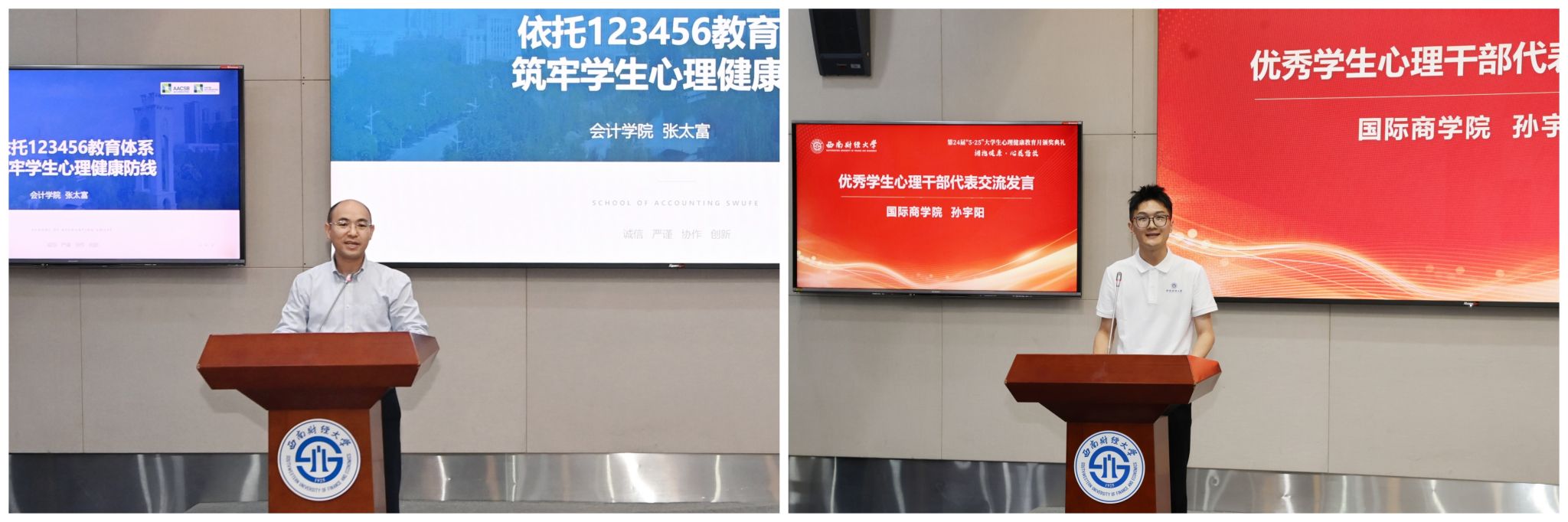 典礼集中展示了心理健康教育月活动开展情况、优秀集体和个人先进事迹,为主题征文比赛和校园心理剧比赛获奖队伍、优秀学生心理干部十佳先进个人、学生心理工作特殊贡献奖获奖者颁奖。会计学院学生工作负责人代表首批学院(研究院)心理工作示范站作交流发言,国际商学院本科生孙宇阳代表优秀学生心理干部作交流发言。