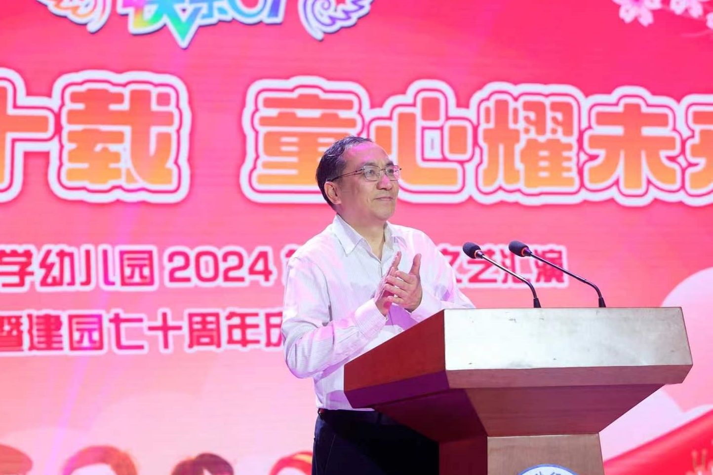 史代敏代表学校向孩子们致以节日的祝福,向关心支持西财幼教建设发展的社会各界、幼儿家长和默默耕耘在保教一线的幼儿教师表示衷心感谢。史代敏表示,在学校党委坚强领导下,在一代代西财幼教人奋斗中,西南财经大学幼儿园从一个20人的托儿所发展到四个园所,软硬件条件持续改善,办园水平质量持续提升,履行好了社会责任,解决好了教职工后顾之忧。史代敏对西财幼教未来发展提出三点要求,一是要始终把幼儿安全摆在首位,紧守安全底线,让社会放心、家长放心、学校放心。二是要不断提升办园质量水平,紧跟学前教育发展形势,抓好职业化专业化教师队伍建设,加强家园协同共建共育。三是要持续打造西财幼教品牌,深化拓展校地携手合作,奋力写好“强国建设、西财担当”幼教篇章。