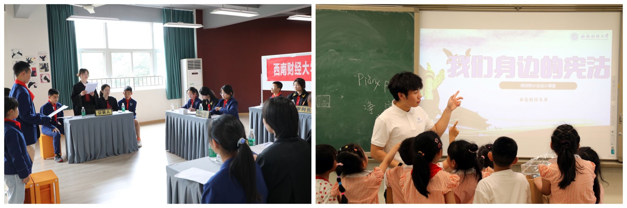 活动由“博士课堂”“模拟法庭”“法治小课堂”“法治游园会”等版块组成,共开展活动8场,累计吸引1100余名师生参与。在“博士课堂”上,学校法学院教师游伟以“数字时代儿童权益的法律保护”为题,聚焦儿童权益法律保护体系建设、儿童涉法涉罪风险预防等,为西财附小全体教师带来一场精彩纷呈的“法治大餐”。在“模拟法庭”中,学校法学院和西财附小的同学们选取“校园暴力”案件作为庭审背景,分别扮演审判员、公诉人、辩护人、被告人、法警等角色,真实还原法庭调查、法庭辩论、法庭宣判等审判过程,让同学们在“沉浸式”体验中感受法律的庄重与威严。在“法治小课堂”上,通过精心设计制作课件、利用多媒体进行内容呈现等方式,围绕身边的宪法、筑牢未成年人保护法治防线、防范网络不良信息等法治教育热点,让孩子们在互动里学习、在案例中思考。在“法治游园会”中,通过精心设计“法律知识大转盘”“案例分析套圈乐”“法词对战”等主题打卡环节,寓教于乐、寓学于趣,让同学们在趣味游园中学习法律知识,共同开启一场奇妙的“法治之旅”。