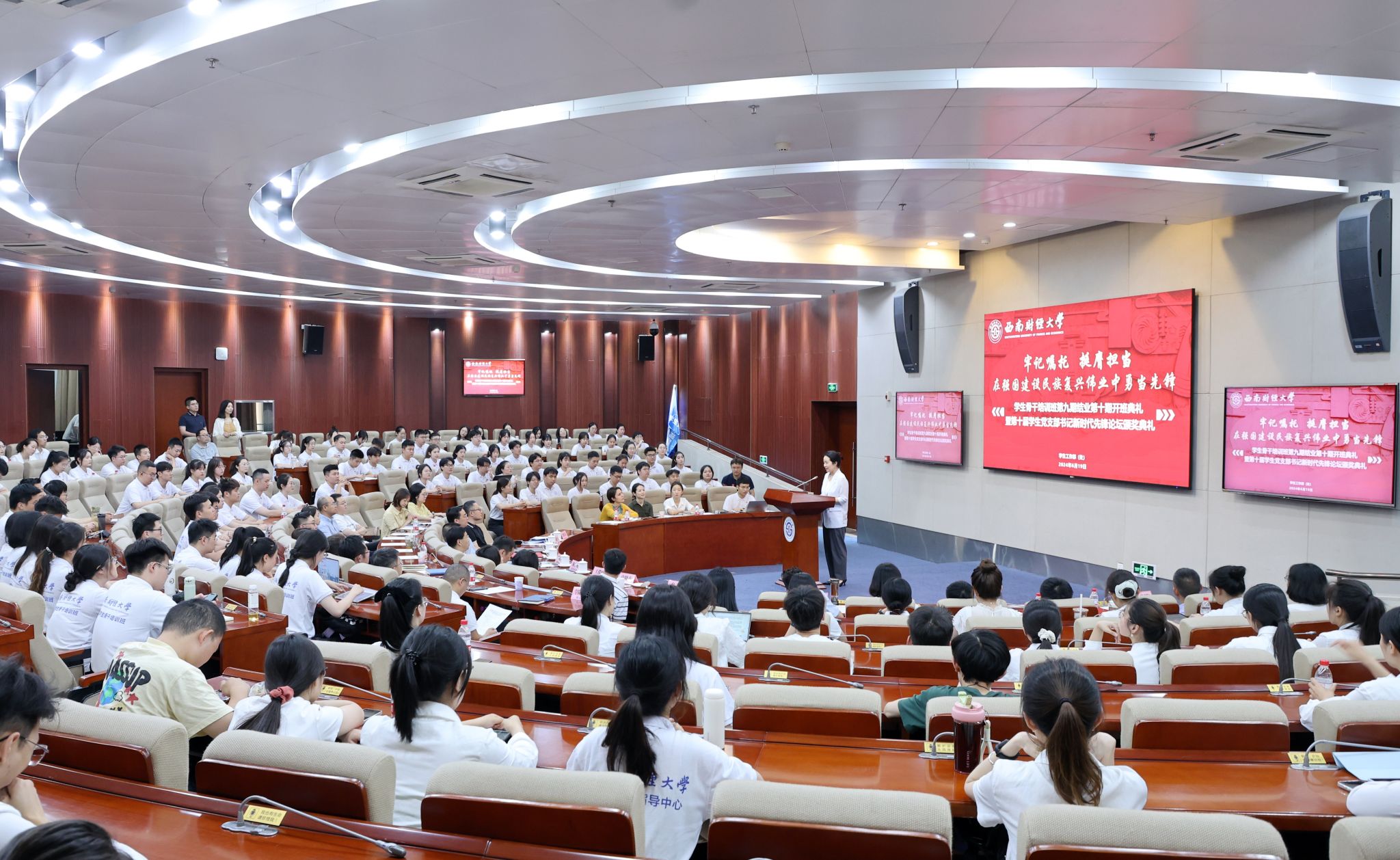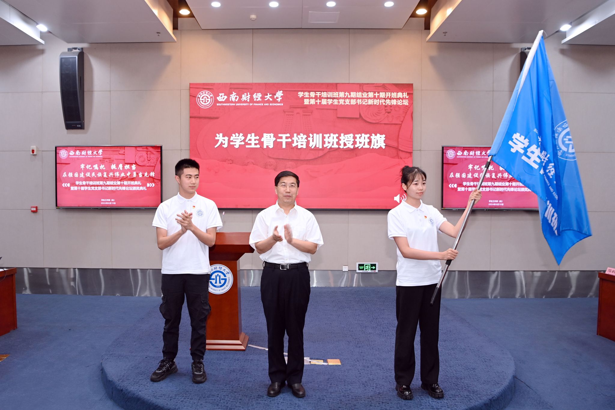 赵建军为第十期学生骨干培训班授班旗。活动现场为第九期学生骨干培训班学员颁发结业证书,与会人员共同观看了学生骨干培训班专题视频。该班自2014年开班以来,已成功举办9期,结业468名学员,积极发挥优秀学生骨干示范引领作用,激励西财青年努力成长为德智体美劳全面发展的时代新人。