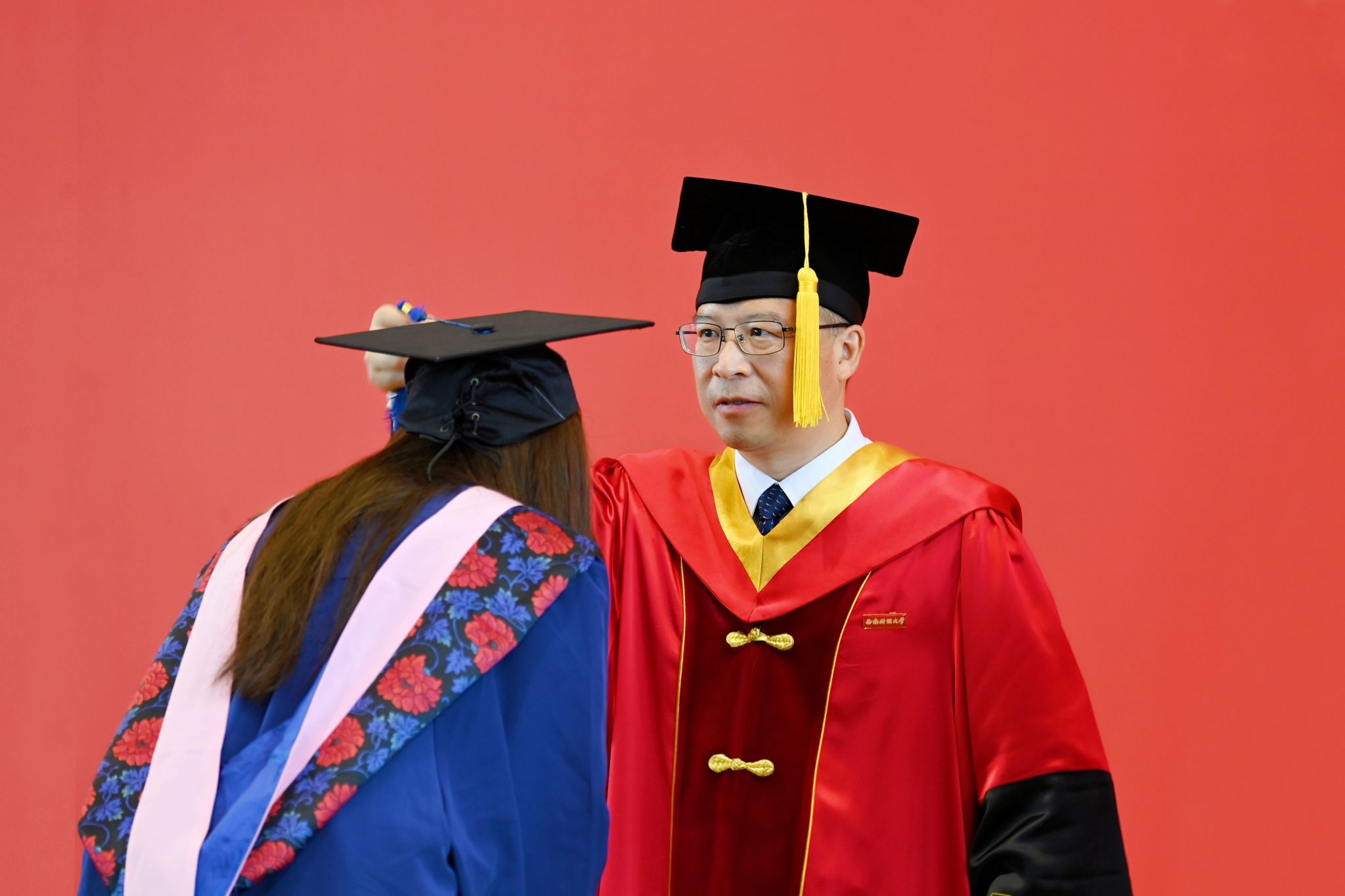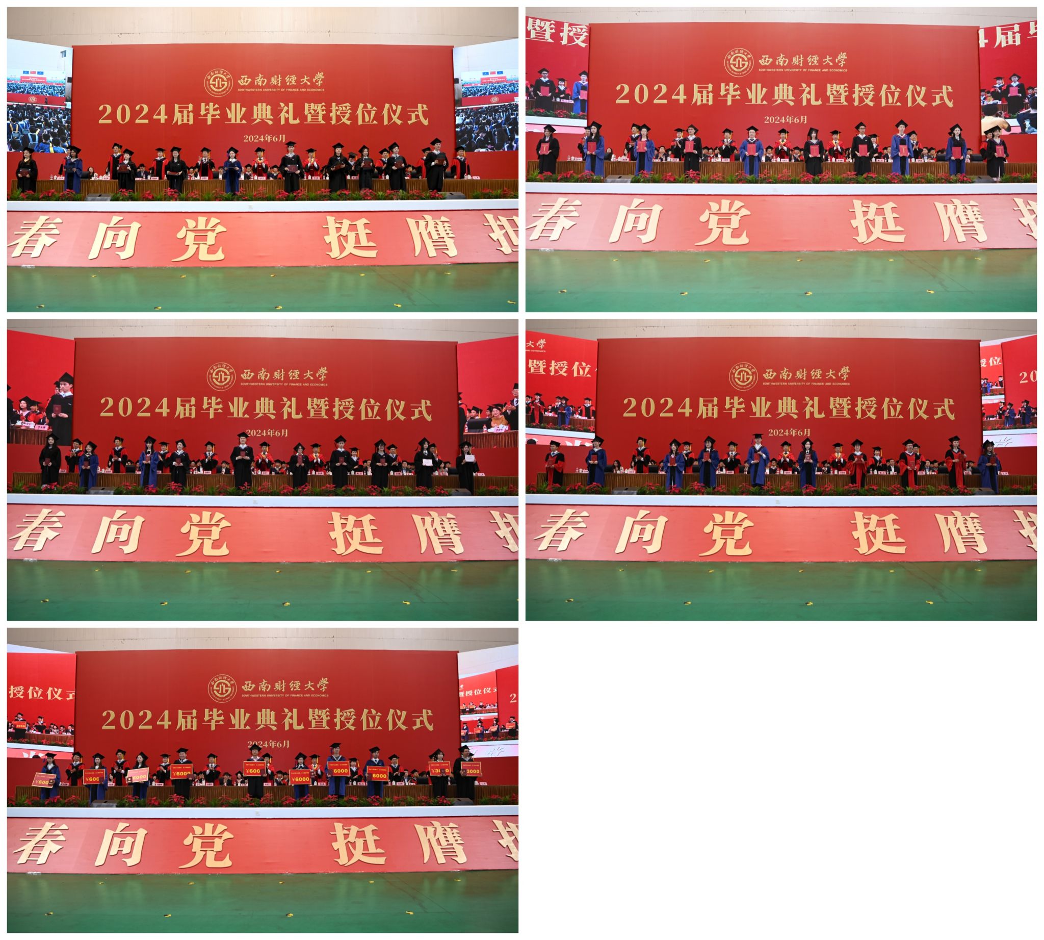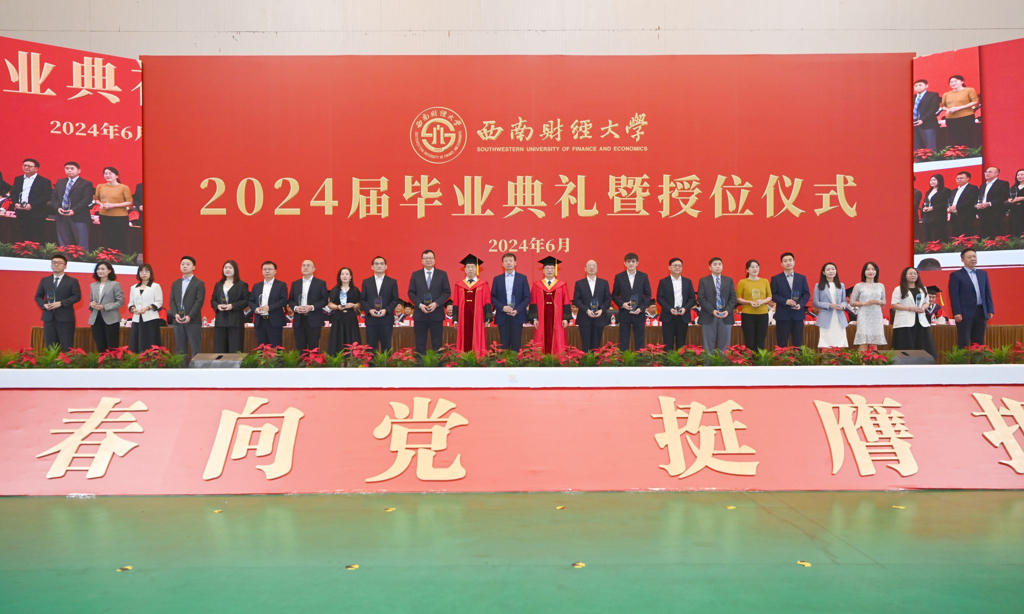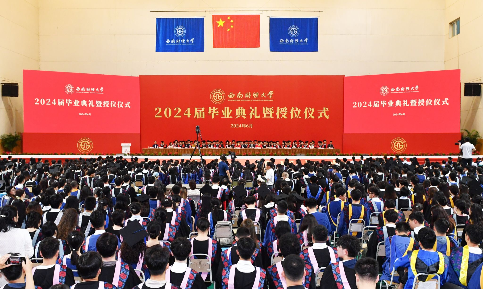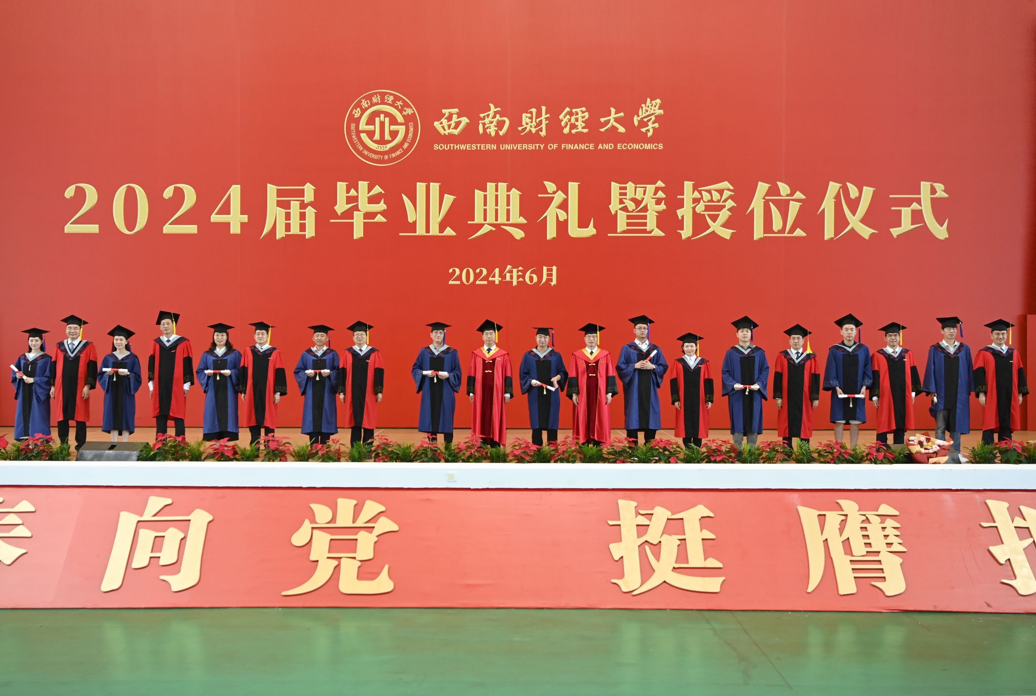 典礼结束后,校领导为毕业生逐一拨穗授位并合影留念。西南财经大学2024届毕业生将坚定理想信念、胸怀“国之大者”、传承西财精神、勇担时代重任,把青春奋斗融入到党和人民的事业之中,融入到强国建设、民族复兴的时代洪流之中,踔厉奋发、勇毅前行,以西财人的使命意识和实干笃行,投身伟大时代,书写精彩人生。