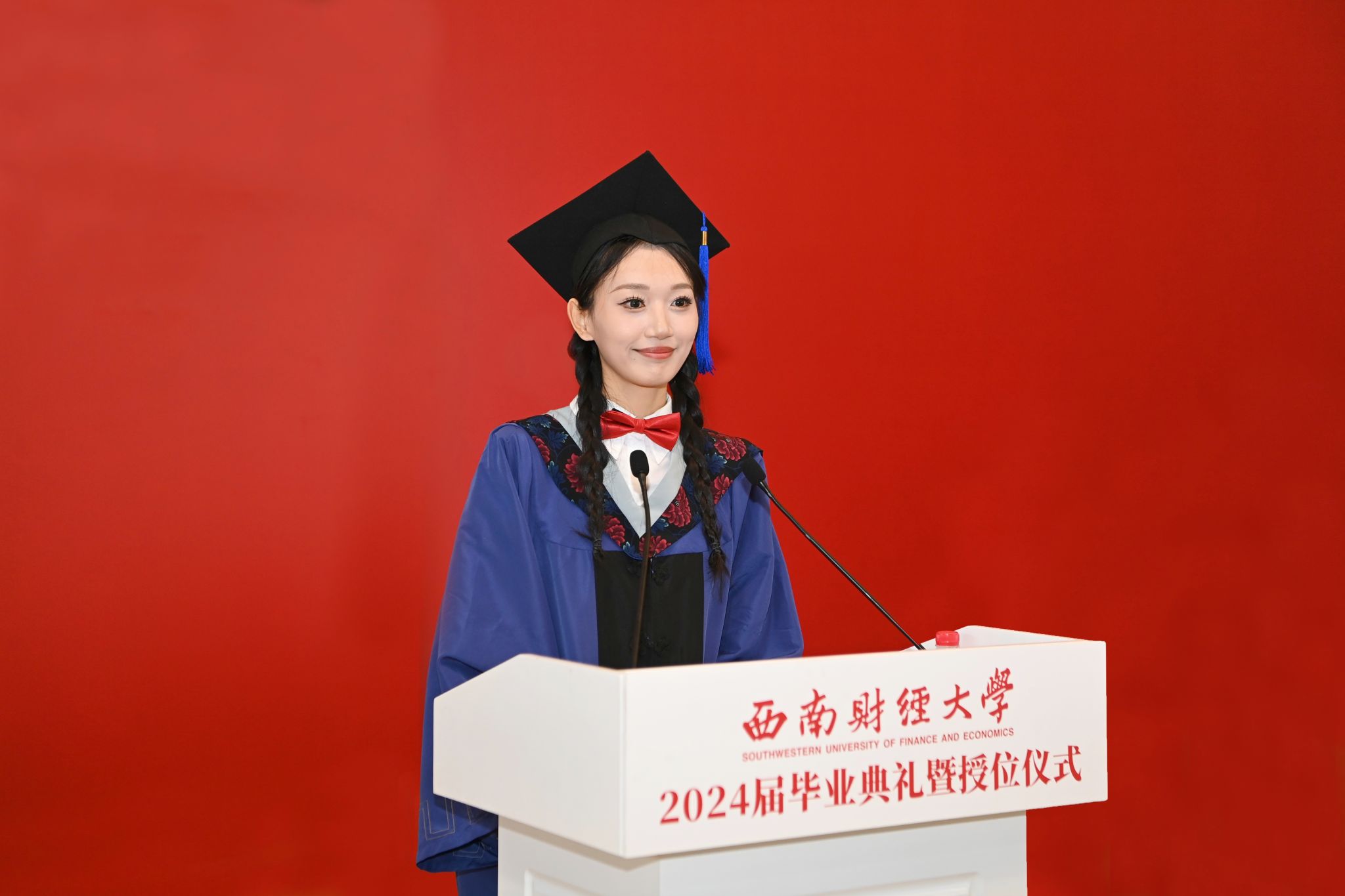 毕业生代表王怡焯发言,与在场师生共同回顾追梦奋斗的西财时光,表达对母校的热爱、对父母的感恩、对师友的不舍,表示将继续践行“经世济民、孜孜以求”西财精神,挺膺担当、砥砺奋斗,力争成为具有社会责任感、创新精神、国际视野的财经领域卓越人才,书写更加辉煌的青春篇章。