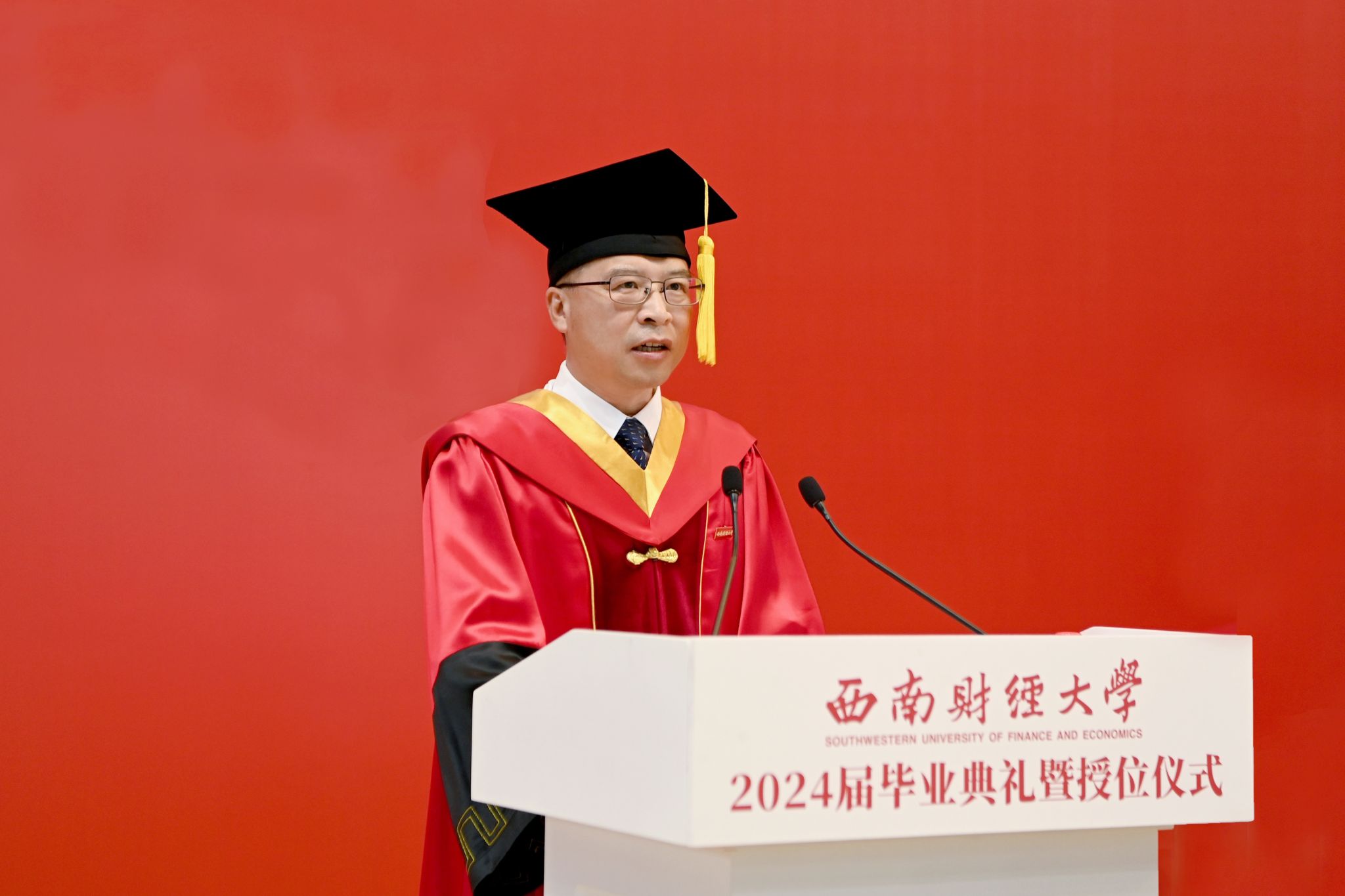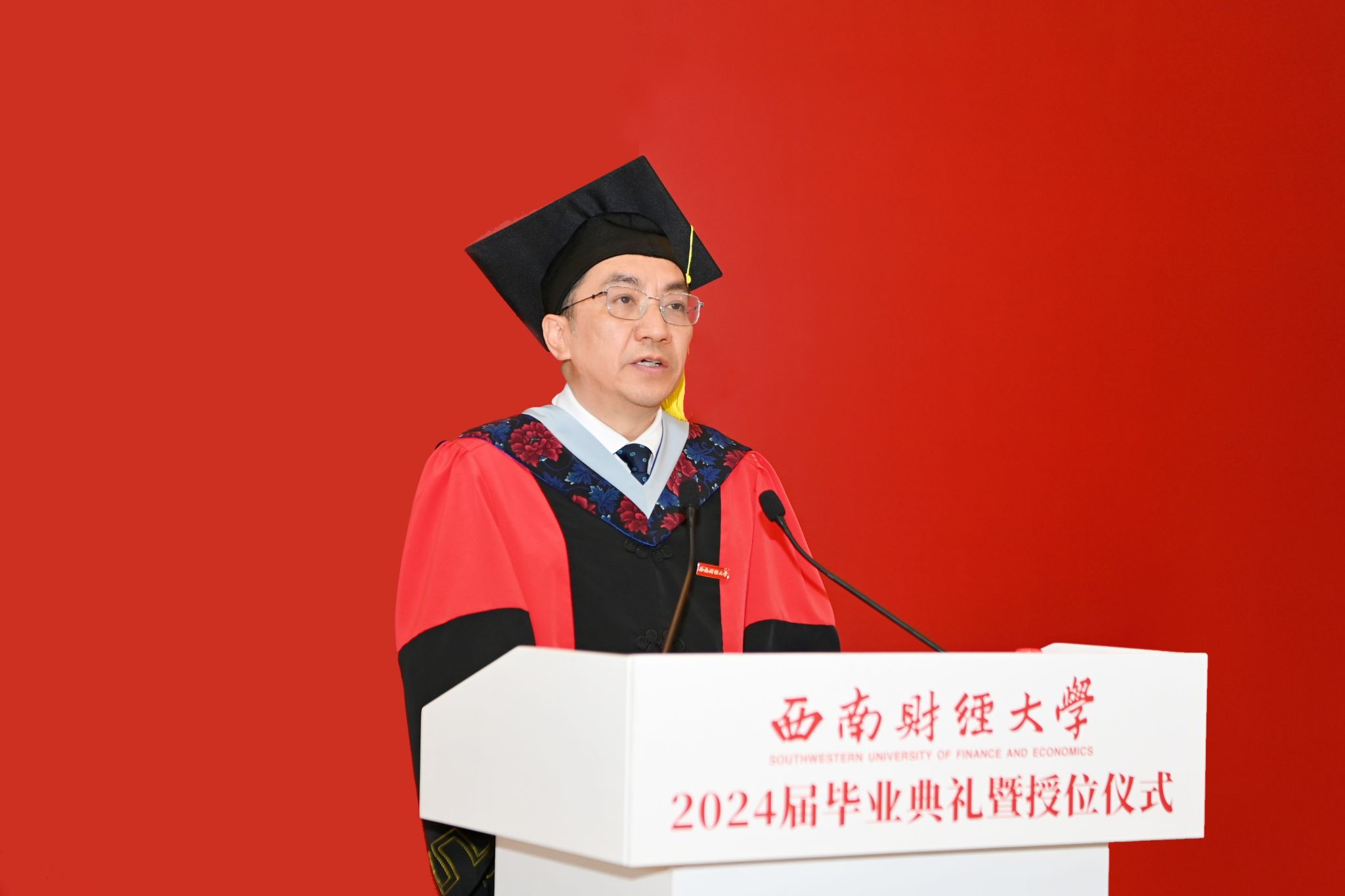 赵建军主持典礼时指出,“经世济民、孜孜以求”的西财精神,既蕴含着一所大学“教育报国”的崇高使命,又饱含着全体师生“爱国奉献”的信念追求,还彰显着财经学科的底蕴特色,是每一名西财人奋进拼搏的思想源泉和不竭动力。他深情勉励毕业生在今后的人生之路上传承好西财精神,做行动派、当实干家,在强国建设、民族复兴伟业中贡献西财青春力量。赵建军寄语西财青年,要树立“经世报国”的远大志向,以理想为帆、奋斗为桨,坚定不移听党话、跟党走,把准人生方向,积极投身强国建设、民族复兴伟业,在“强国有我”的实践中不断提高本领能力,自觉在以中国式现代化全面推进中华民族伟大复兴的崭新征程中挺膺担当。要厚植“济民安邦”的为民情怀,涵养“我将无我”的境界、扛牢“不负人民”的责任,坚持人民至上,在工作岗位上深入基层、深入群众,既向人民群众学习,更解决他们的急难愁盼问题,自觉做到民之所忧,我必念之;民之所盼,我必行之。要锤炼“孜孜以求”的坚韧品格,以奔腾不息的动力、上下求索的毅力,干一行、爱一行、钻一行,勇于做先锋、当闯将,在急难险重中强壮筋骨,在摸爬滚打中增长才干,迎难而上、艰苦奋斗、坚韧不拔,一步一个脚印,在新时代新征程上留下无悔的青春足迹。