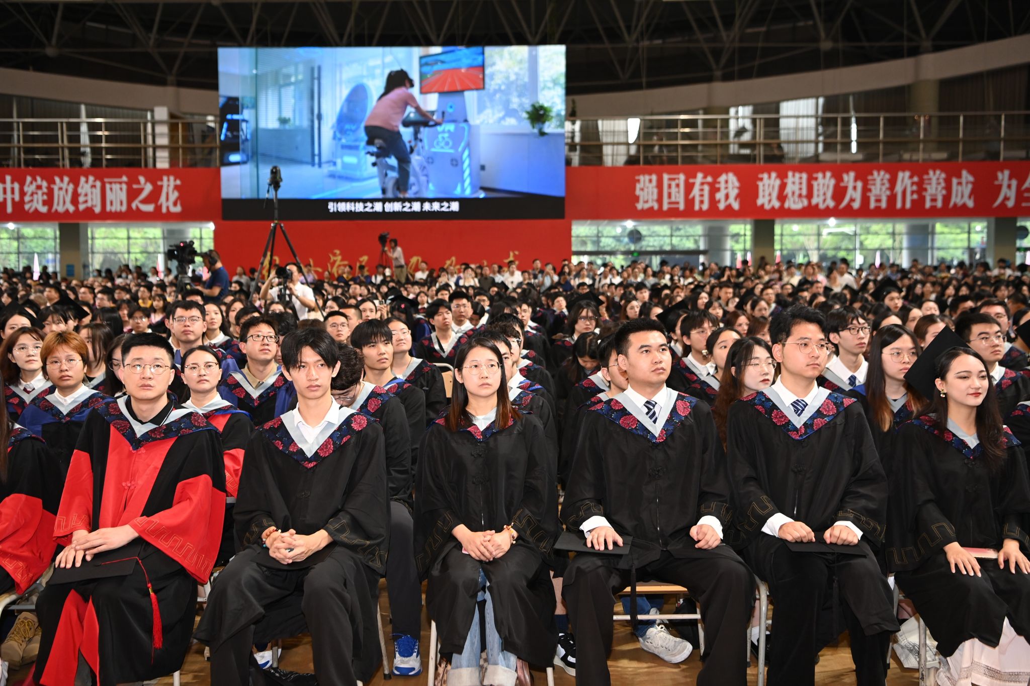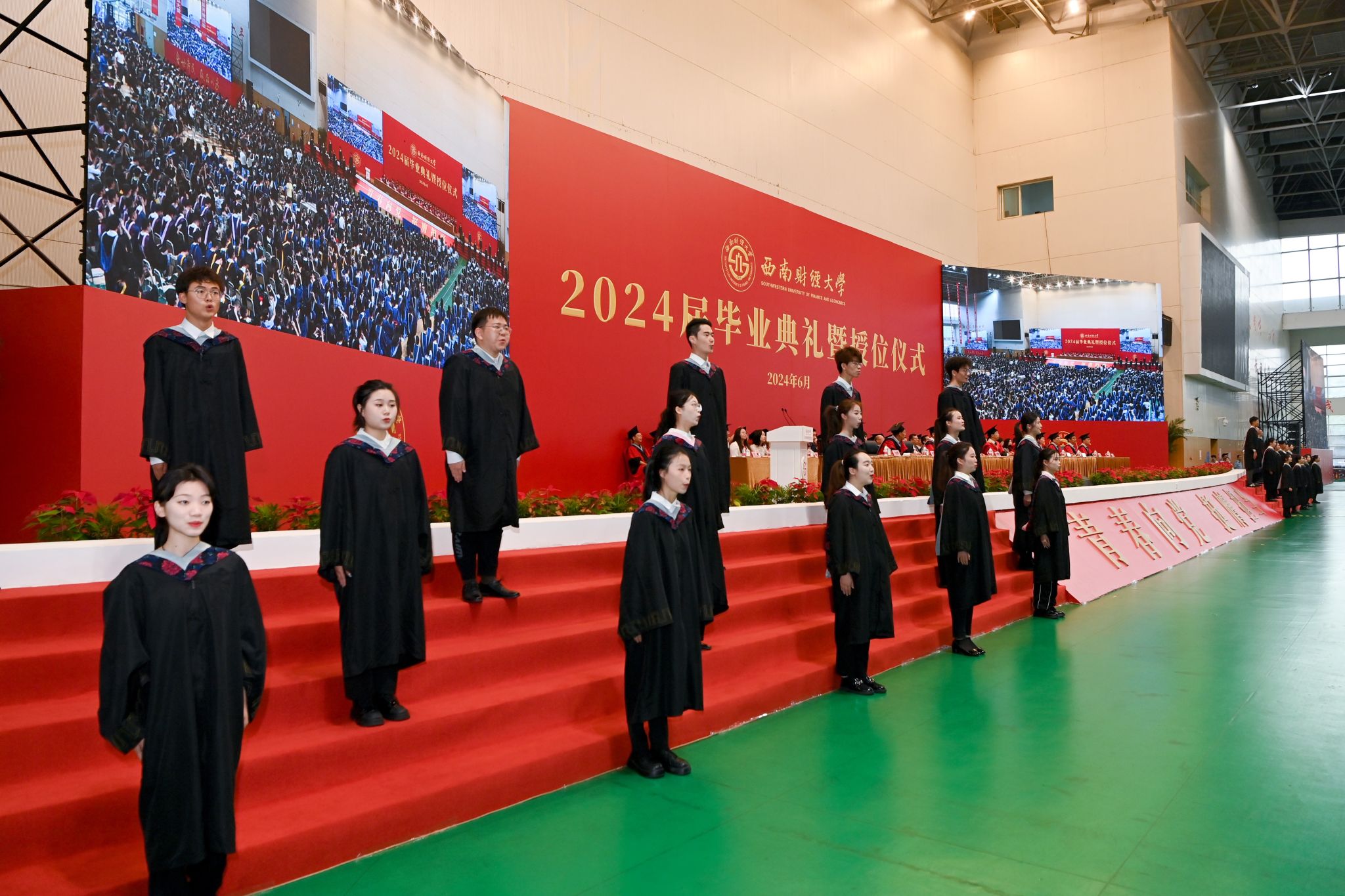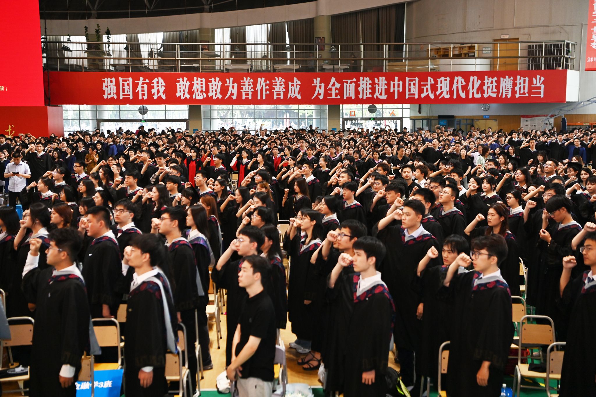 全场毕业生高举右拳齐声宣誓:将传承西财精神、发扬西财校训,坚定理想信念、锤炼过硬本领、肩负社会责任、担当时代使命,让青春在祖国和人民最需要的地方绽放,为中华民族伟大复兴和人类文明共同进步贡献力量。