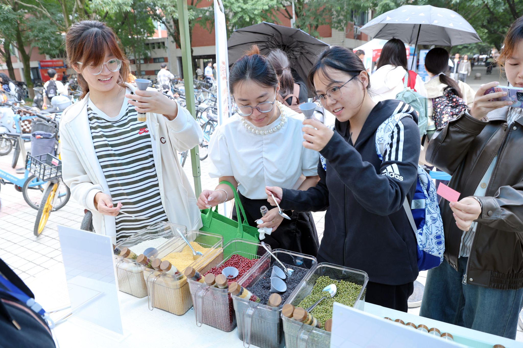 活动当天,柳林校区五谷堂外热闹非凡,一场别开生面的“识谷辨粮,乐享丰收”主题游园活动吸引众多师生参与。同学们在轻松愉快的氛围中通过农作物图片辨识各类粮食,了解它们的生长过程和营养价值,并亲手用大米、小米、红豆、绿豆等粮食制作“丰收瓶”,寓教于乐学农事,融学于趣识五谷,身体力行惜粮食,切实感悟“一粥一饭,当思来之不易”,加深节粮及反食品浪费认识。