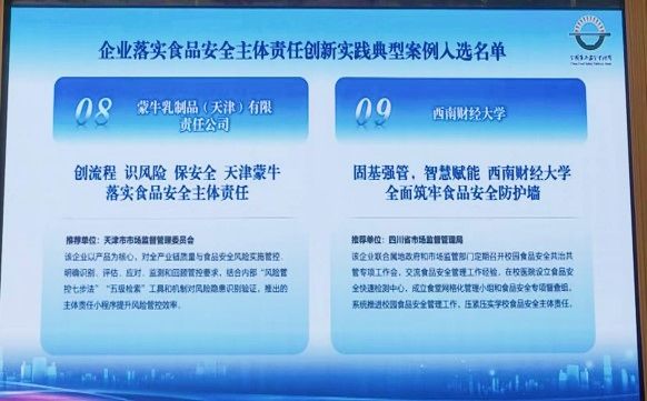 10月31日,落实企业食品安全主体责任经验交流会在国家市场监督管理总局举行。会上发布了经各省级市场监管部门初评、国家市场监督管理总局复评和终评的企业(单位)落实食品安全主体责任创新实践典型案例,全国共25项,我校《固基强管,智慧赋能,全面筑牢西南财经大学食品安全防护墙》成功入选。学校党委常委、副校长史代敏出席会议,并代表学校作为6家企业(单位)之一,在会上交流经验做法。