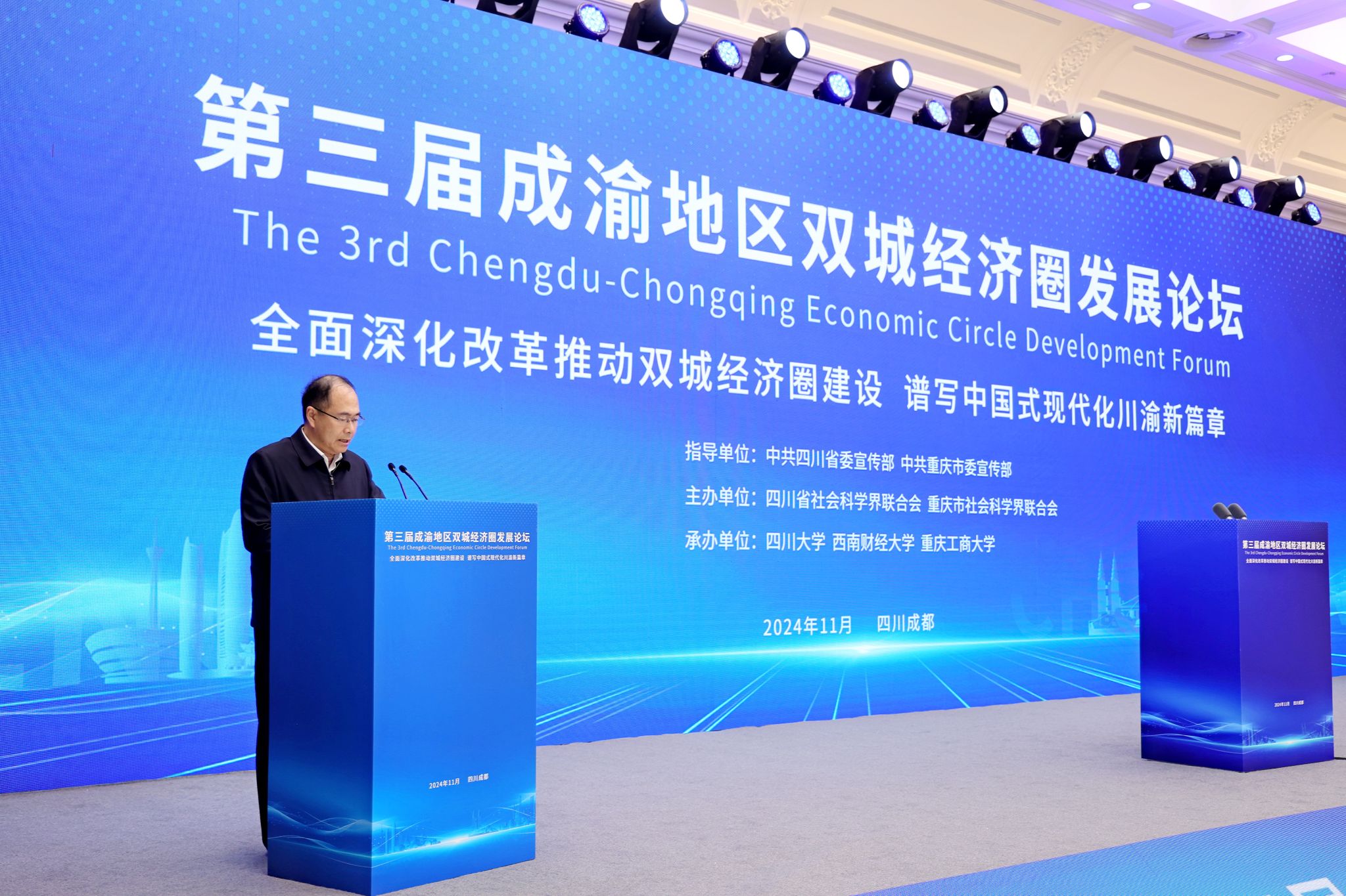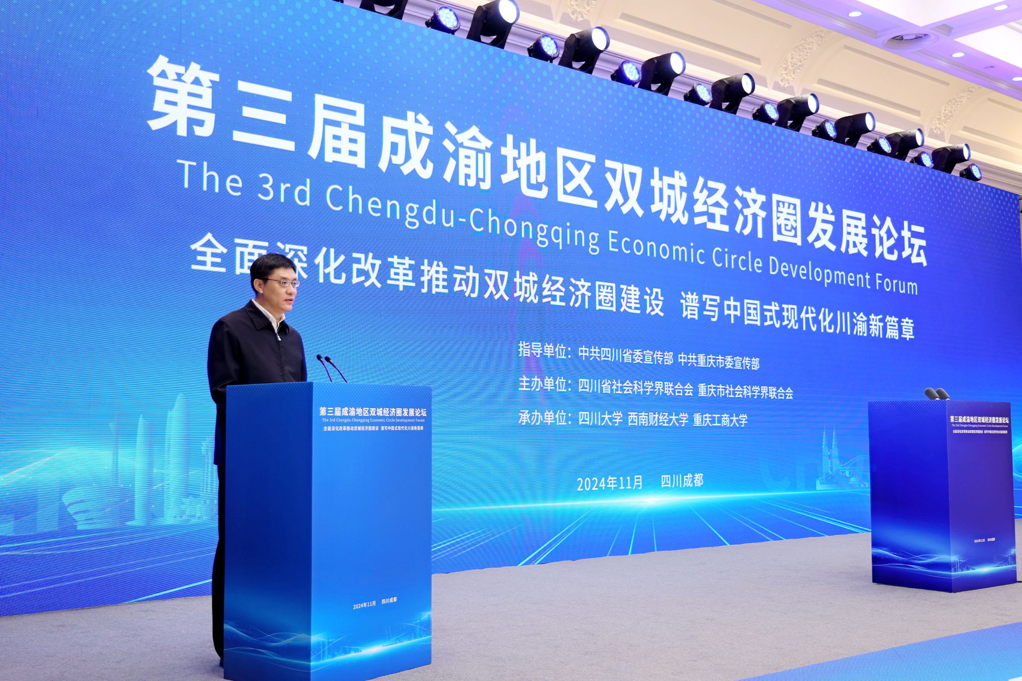 11月13日,由四川省委宣传部、重庆市委宣传部指导,四川省社科联和重庆市社科联联合主办,四川大学、西南财经大学、重庆工商大学联合承办的“第三届成渝地区双城经济圈发展论坛”在成都举行。四川省委常委、宣传部部长、省社科联主席郑莉宣布论坛开幕。四川省人民政府副省长胡云,重庆市委常委、宣传部部长、市社科联主席姜辉出席并致辞。西南财经大学党委书记赵建军主持主旨报告。